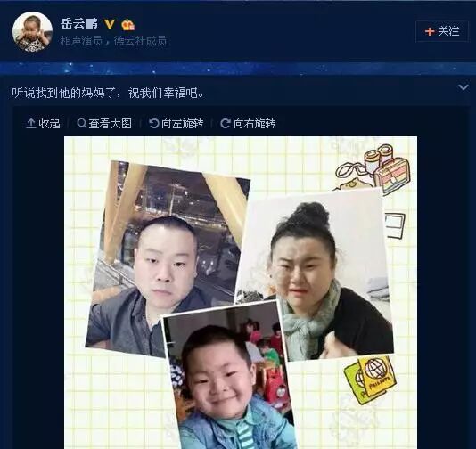 随后网友们纷纷感叹:我的天哪,这么神奇吗?更有网友调侃道:小岳岳的媳妇正在赶来的路上。之后岳云鹏又在其微博发布了一组照片,配文:听说找到他的妈妈了,祝我们幸福吧。