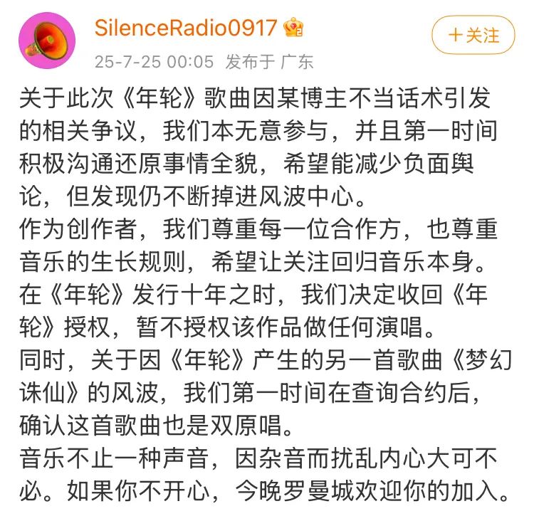 汪苏泷和张碧晨在争什么,我搞明白了 新周刊 内地女星 2025-07-30 08:06:58 121 创作不易,用心坚持,欢迎请BaGua喝几杯爱心咖啡!打赏并支持本文 打赏并删除本文 原唱与原创,孰轻孰重?又或者二者其实都不重要,对于音乐来说,唱出打动人的原始情感,才是唯一重点。作者 | 草莓脆编辑 | 陆一鸣题图 | Unsplash最初,没有人在意这场演唱会的争议,以为不过是一场蒙面演唱会官宣后的质疑、一次网红歌手翻车,直到这场闹剧的走向逐渐偏离原点,成了大家都耳熟能详的娱乐话题。如果上天能给旺仔小乔再一次机会,不知道她还会不会坚持说那句话——“我发一百遍《年轮》也只会写张碧晨原唱”。喜欢学习的同学有福了。现在正是学习“蝴蝶效应”的大好时机,新鲜例子就在眼前。(图/@旺仔小乔 评论区截图)7月上旬,拥有2300万粉丝的短视频博主@旺仔小乔宣布举办个人演唱会,演出将以不露脸的形式进行。最低票价为268元,最高票价968元。缺乏原创歌曲的翻唱网红开演唱会、蒙面演出难以保证真唱质量、被质疑的高票价等一系列槽点,瞬间让旺仔小乔陷入舆论争议。这本来是常见的“割粉丝韭菜”套路,但随着旺仔小乔几年前关于歌曲《年轮》的评论被扒出,事情开始有了不一样的走向。(图/视频截图)当时,在回复网友评论时,旺仔小乔坚称《年轮》由汪苏泷创作,但原唱是张碧晨,还强调 “我认定的事不会改”。随后#旺仔小乔说年轮原唱不是汪苏泷 词条冲上热搜,阅读破亿,变成时下最热话题,QQ音乐平台对《年轮》的张碧晨和汪苏泷两版本的标注进行了多次调整。汪苏泷团队于7月25日发布微博,声明《年轮》为“双原唱”,并宣布收回《年轮》授权。张碧晨工作室随后发文称,经所有可查证的公开音乐发行记录明确显示,张碧晨演唱的《年轮》是首个公开发行并广泛传播的录音版本,并且在2015年受邀演唱歌曲时,也从未被告知该歌曲在同时期有其他艺人再版,也并未在合同签署中有过关于约定多版演唱者的任何描述。因此,张碧晨是《年轮》的“唯一原唱”。(图/社交平台截图)于是,几天内,每个社交平台的热搜榜单都被《年轮》相关话题反复刷屏。张碧晨和汪苏泷双方工作室“正主下场”发布声明,更是把这一事件推上风口浪尖。而对于生命不息学习不止的吃瓜观众来说,此时关心的事情还可以有一个:被争来抢去的“原唱”,究竟是什么?我们与两位法律从业者,法律博主杜治根(@根根要打官司到80岁)和广东纬联律师事务所律师谢芝华,进行对话,试图厘清这一热点事件中的法律细节。原唱VS著作权人,谁更有话事权?《新周刊》:从法律层面来说,“原唱”的定义是什么?杜治根:原唱不等于著作权人。原唱不是法律上的概念,《著作权法》未使用“原唱”一词,仅规定了“表演者”的权利,包括表明身份、保护表演形象、授权使用表演等。实践中,行业内的“原唱”指首次公开发表录音或演出的歌手,核心是“时间优先”原则。在《年轮》这首歌发行的时候,张碧晨的版本先开始在网络上出现,符合“时间优先”原则,满足首次公开发表录音或演出的歌手的要求。(图/unsplash)谢芝华:法律并未对“原唱”作出明确定义,也未赋予其独立于著作权人、表演者等身份之外的特殊法律地位。“原唱”歌手对录音制品的表演享有邻接权(表演者权),而非作品的著作权。与“原唱”的相关权利主要是“表演者权”“录音制品权”等。例如:表演者权包括表明表演者身份、许可他人录音录像并获得报酬的权利(《著作权法》第三十九条);录音制作者权则保护首次将表演固定在载体上的主体(《著作权法》第四十四条)。简单来讲,“原唱”身份享有的相关权利须依照《著作权法》及相关法规中关于“表演者权利”“录音制品权利”等条款来确定。《新周刊》:从两位歌手的声明来看,他们的真正诉求是什么,在法律上来说是合法的吗?杜治根:张碧晨方主张自身是《年轮》的唯一原唱,汪苏珑方主张《年轮》是“双原唱”。张碧晨方是以“首发时间优先”(2015年6月15日)和“影视唯一使用版本”为依据,主张“唯一原唱”身份。汪苏泷方以“词曲著作权人”身份主张“双原唱”事实,并收回授权以限制未来翻唱行为。汪苏泷作为著作权人,有权决定是否授权他人使用作品,包括收回已授予的表演权许可。(图/pexels)在双方没有明确合同条款显示歌曲版权被买断的情况下,汪苏泷可以让“原唱”变成“原本可以唱”。时间线上,这件事情已经过去十年了,当时的沟通细节,相关人员可能都记不清了。在著作权上,不管是各个平台的宣发,或者是双方现阶段公布出来的材料看,双方的共识都是汪苏泷所有。那么对于是否为“唯一原唱”,我认为在法律上没有多大意义。如果双方的合同约定了《年轮》的版权买断的情况下,这场争论没有意义,直接按合同约定履行即可。我认为大概率是对这种情况没有约定。对于汪苏泷而言,他不仅能自己唱,自己演,甚至还能自己改编。但张碧晨作为表演者,则只能演好当前的作品。不过在其他方面,比如用户的认知、情感需求、商业决策等方面,可能会有不同的考量。谢芝华:张碧晨方作为表演者,其权利限于合同约定的表演权以及基于表演产生的录音制作者权,所以张碧晨方的核心诉求就是确认“原唱”身份(署名)、维护演唱者权益(享有表演权)。“值此《年轮》发行十