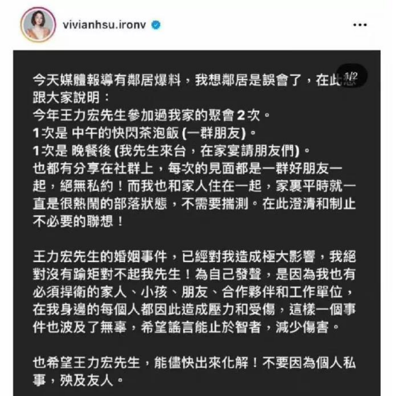 在三篇声明中,徐若瑄一边解释,今年的两次聚会,一次是中午的快闪茶泡饭,有一群朋友一起,一次是在家宴请朋友,先生也在场。