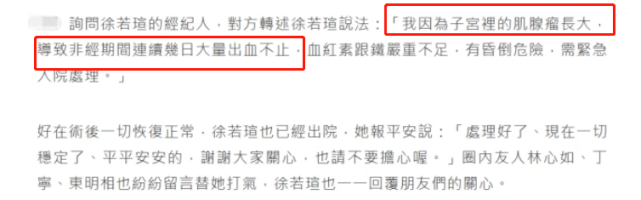 据经纪人证实,徐若瑄此次生病的原因是长期的疲劳工作,让腹部的腺瘤迅速长大,导致突然的大出血。