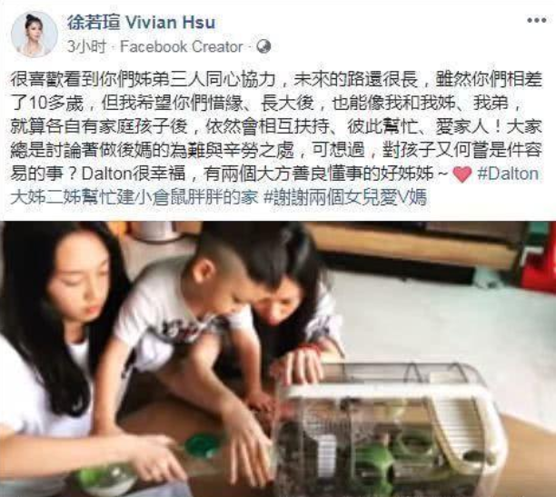 儿子三岁时,徐若瑄还晒出两个女儿和弟弟一起玩耍的视频,大赞两个姐姐好懂事,弟弟好幸福。