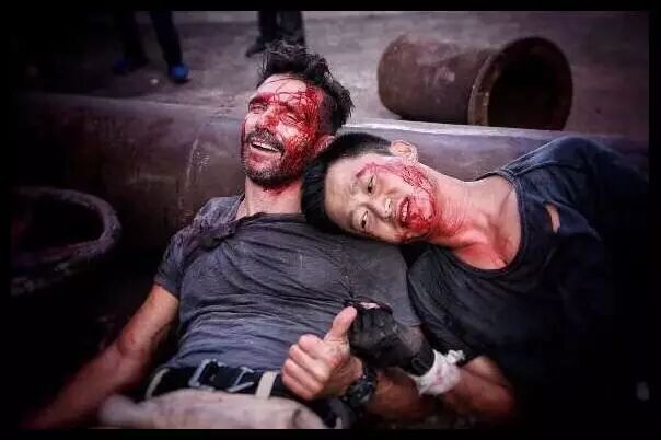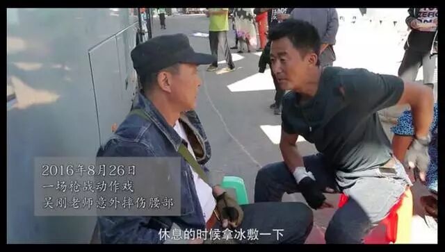 吴刚拍戏也意外受伤,吴京边上示范怎么用冰敷来之治疗。真的很佩服这些演员,玩命的演出,才奉献出如此精彩的电影。