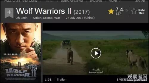 28日《战狼》在美国首映IMBd综合评分7.4,烂番茄上86%观众表示喜欢《战狼》。