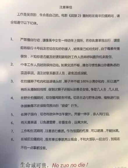 除了电影本身的高水准,《战狼2》特殊的拍摄过程也受到大家的关注,导演吴京本人也再一次受到关注,之前网上曝光的一份吴京给剧组的通知书也是引起热议,网友们纷纷表示:这很吴京!