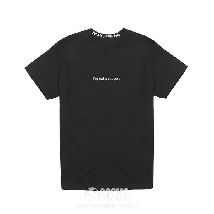 Fxxk Art, Make Tees 是一个来自法国的街头品牌,他们强调通过标语来传达设计概念,不愿臣服在人群中的特立独行。品牌相继推出了『need money,not friends』『I'm not a rapper』『unfollow』等带有叛逆嘲讽字句的单品。吴制片人的街拍中早早就出现了这件“I'm not a rapper”。