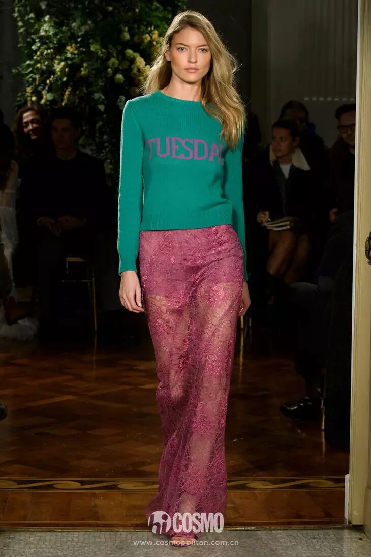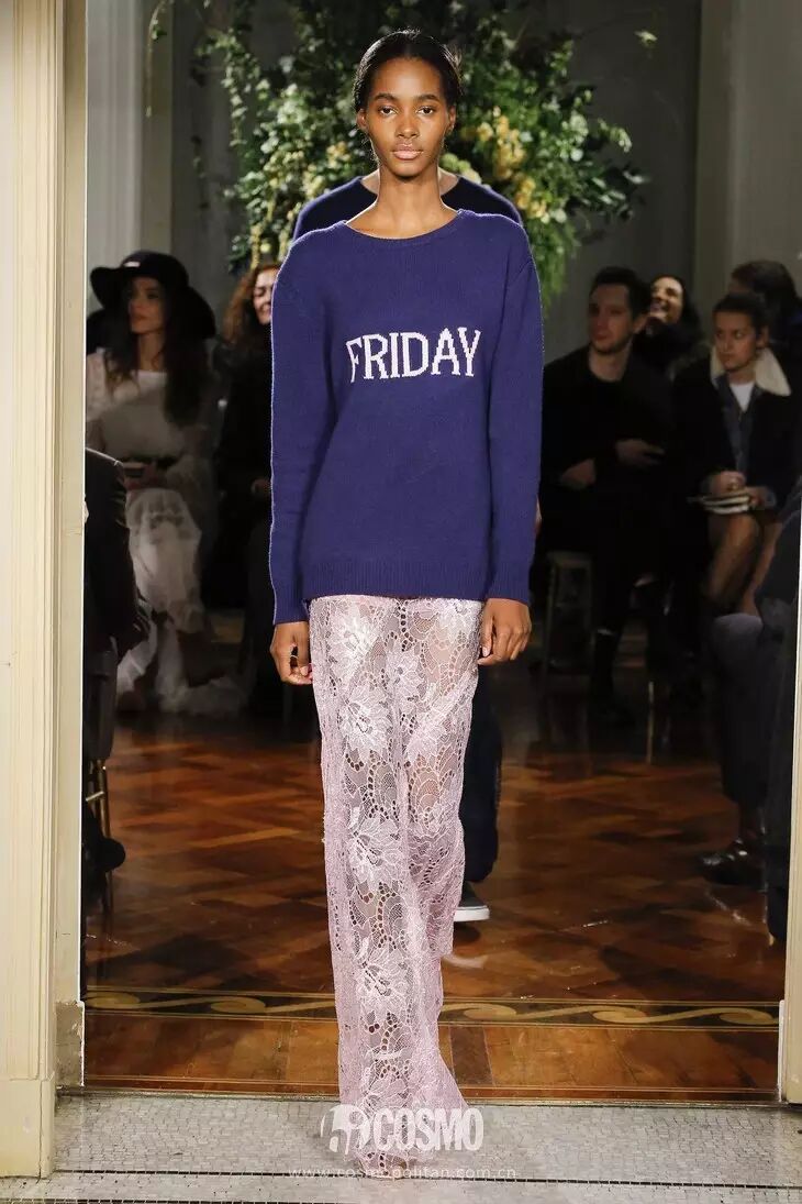 同为浪漫主义风的Alberta Feretti早在2017早秋的时装秀就推出了Rainbow Week系列,一周7天的英文字母以同等比例排列,搭配跳跃的色彩,完全颠覆了以往COCO对于这个品牌的印象。设计师更是俏皮地说:“因为自己常忙到忘记星期几,不如就把「今天星期几」穿在身上,这样就不会忘记了!”