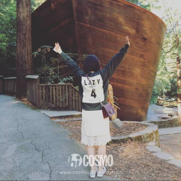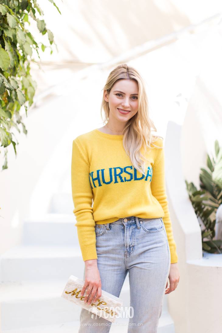 黄色与蓝色的结合,整个人就像是一个行走的发光体,假期来临前连空气都是愉悦。