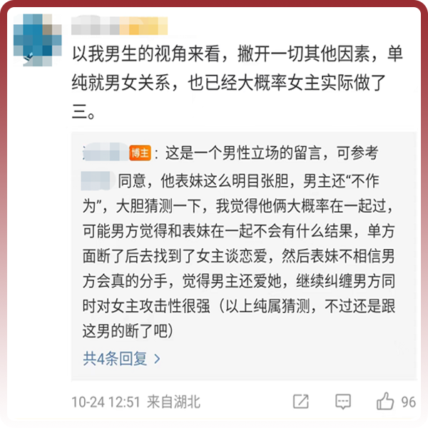 一位女生投稿给博主,诉说男友和其表妹的暧昧关系。