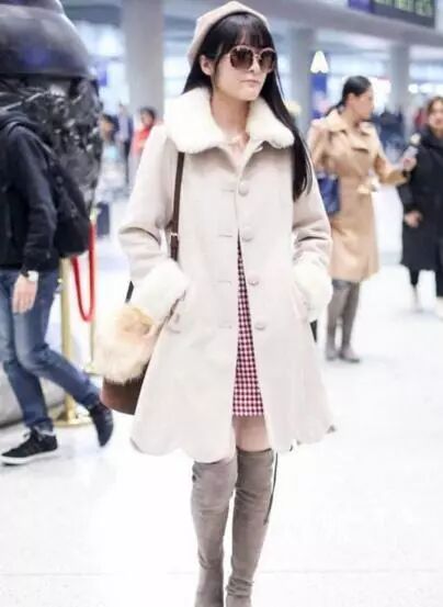 在机场穿的很舒适保暖呢,米白色大衣内搭格子裙,还是挺文艺范儿的,搭配的过膝长靴还是挺显腿长的。