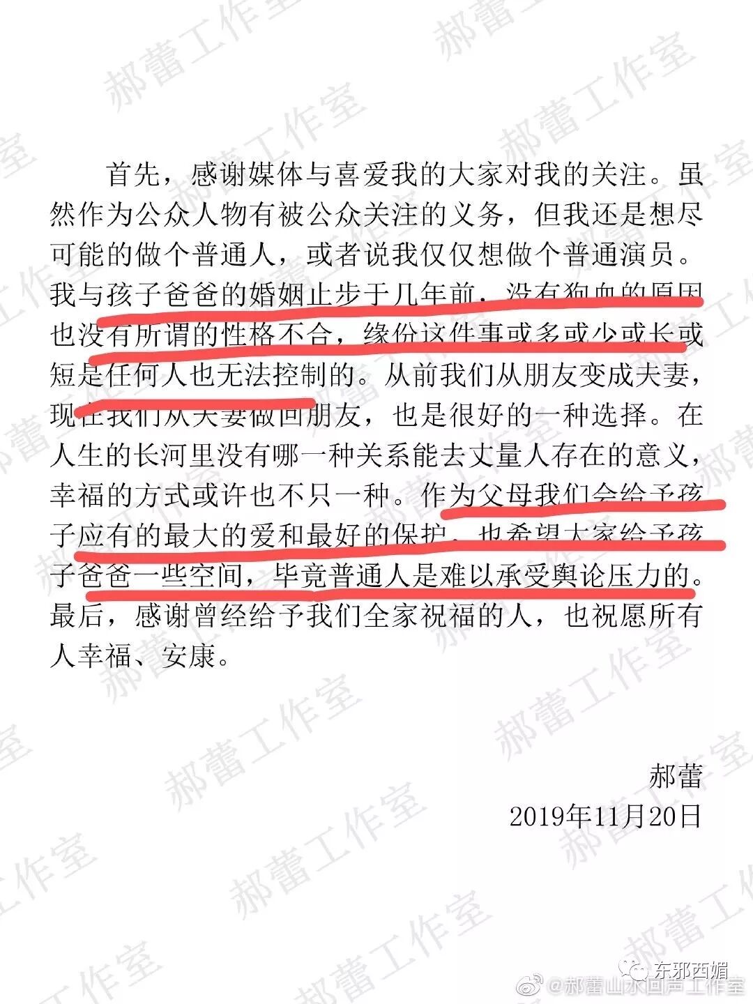 郝蕾悄悄离婚了!分手不撕,是给彼此最好的体面 东邪西媚 内地女星 2019-11-20 22:43:05 748 创作不易,用心坚持,欢迎请BaGua喝几杯爱心咖啡!打赏并支持本文 打赏并删除本文 猝不及防!傍晚时分,郝蕾工作室发出声明,宣布她和第二任丈夫刘烨(圈外人)已经在几年前离婚。突如其来的宣布,应该是因为:有媒体拍到郝蕾与一名“神秘男”同行的照片。所以,原来郝蕾早已恢复单身,那么有感情新进展也是很正常的事情了。不过八八还是有些唏嘘。她曾经历过与邓超轰轰烈烈的分分合合,后来又是与李光洁狗血一地的婚姻。2012年她嫁给圈外人刘烨,后来生下可爱的双胞胎,大家都以为她从此找到了幸福,没想到第二段婚姻还是画上了句号。可能就像她声明中说的那样吧:缘分这件事或多或少或长或短,是任何人都无法控制的。出乎八八意料的是,评论区里有不少人说,差点看成鲍蕾,两人分不清......啊,怎么能分不清呢?郝蕾这个“只想生活得强烈一些”的女孩,在娱乐圈中,独一无二。——我是神来之笔的分割线——她是《17岁不哭》里伶俐能干敢怒敢言的杨宇凌,拍这部剧时她才大学二年级。她是《少年天子》里的皇后。这个宁为玉碎不为瓦全。这个不疯魔不成活的深宫女子,一面骄纵跋扈,一面恣肆率性。许多观众赞叹她的演出犹如“神来之笔”,而她当时才23岁,大学毕业刚两年。25岁时,她主演了话剧《恋爱的犀牛》。谁能不爱上她演的明明呢?长得这么美,演得这么烈,又唱了一首这样挠人心的歌:明明所有的光芒都向我涌来,所有的氧气都被我吸光,所有的物体都失去重量......这首歌改了歌词后,放到了06年的电影《颐和园》里:享用我吧,现在,人生如此漂泊不定;想起我吧,将来,在你变老的那一年~~这部片让郝蕾变成了无数文艺青年的女神,他们神魂颠倒地说:她笑起来很好看,但下一秒总担心她会流泪。但剧组的违规参赛,也连累郝蕾的电影事业停滞了将近三年。除了事业的暂停,拍这部片时郝蕾还失去了爱情。她和邓超的恋情是从《少年天子》开始的。剧里他们是天子和皇后,而剧外,她说:我从来没有那样爱过一个人。这一段情以撕心裂肺的分手告终,让很多人为之惋惜。流传最广的说法,是郝蕾在颐和园中有大尺度演出,令邓超难以忍受而分手。其实郝蕾曾澄清,她因担心邓超不能接受,拒绝过这部片。但随即发现邓超已和自己渐行渐远。她是因为两人感情已破裂,剧组又坚持等她,最后才接拍。而不是因为拍了片导致感情出问题。郝蕾没有透露自己跟邓超之间,到底是出了什么样的问题。不过按时间推算,那正是媒体爆出郝蕾怀疑邓超劈腿、大闹剧组的时候。邓超当时在拍的是这部剧,同剧女主角是田海蓉。当时媒体记者向剧组打听,一名工作人员称确有其事,还指“第三者”不是田海蓉,而是剧中另一名女主角。可剧中另一名女主角是程莉莎,当时的男友就是跟郝蕾搭档主演《颐和园》的郭晓冬啊。他们结婚后恩爱至今,《妻子的浪漫旅行》中,不少观众都被程莉莎的表现圈粉。郝蕾后来表示,这是剧组故意宣传炒作,她和邓超当时对这种手法一无所知,中了圈套。现在回头看,或许邓超跟郝蕾原本就不是一路人,分开也是注定的吧。当记者重提往事,郝蕾只淡淡地说,大家现在都各自过自己的生活,他很幸福,我也很替他高兴。2011年邓超和孙俪结婚时,郝蕾在微博送上祝福:福临,幸福,快乐!当时的郝蕾,刚刚从又一次受伤中走出来。——我是渣男疑云的分割线——08年9月,郝蕾对媒体承认和李光洁已领证结婚一年,媒体的标题里连李光洁的名字都没出,可见当时他的名气实在不大。那年12月,他们宣布第二年将补摆婚宴。两人领证时李光洁没钱没名气,戒指婚礼一概没有。后来他们上访谈节目,主持人还开玩笑说:郝蕾你是不是昏头了,这样也肯嫁给他?就在预定补办婚宴的那一年,媒体爆出了“李光洁牵手神秘女入公寓”的新闻。接着,媒体又拍到郝蕾端午节在街头独自痛哭的照片。这时李光洁出来回应称:被拍到和他在一起的,是兄弟的女友,所谓“牵手”是被塑料袋遮挡造成视觉差。而郝蕾也发出声明,称四月份李光洁就搬离了两人同居的公寓,他们已经分手,跟所谓的“牵手照”无关。本来呢,清官难断家务事。两夫妻分分合合啥原因,外人也不好判断。但不少郝蕾粉丝气愤指责李光洁是渣男,主要基于以下一些理由:首先,他们认为原先没名气的李光洁攀上郝蕾后资源飞升,一直在利用她。甚至那年四月他已经搬离他们的家,宣传自己的作品时还对记者谎称将补办婚礼。此外两人离婚后,网上出现了一批为李光洁“牵手门”叫屈的稿件;平时比较低调的郝蕾,却被接连偷拍日常并加以恶意描写。郝蕾粉丝找到当时李光洁经纪人和卓伟一起喝酒的照片,并因此坚信郝蕾是被对方串联设计了。而那段时间,郝蕾连发多条微博,痛骂有人威胁她的粉丝、给她经纪人发威胁短信和照片,似乎因不堪骚扰到了忍耐极限。就在她心情差到极点的那段时期,网上又冒出疑似水军死缠烂打地追着她骂。烈性子的郝蕾终于情绪失控,某晚突然连发微博大骂河南人。(注:李光洁就是河南人)河南媒体大怒,发表了社论:你!必须向河南人道歉。后来在杨澜主持的"女人天下节目”上,郝蕾解释说她是用词不当,并不是骂河南人,并向“那些无辜的人”道歉。郝蕾的粉丝认定,她被骚扰被威胁背后,是李光洁的身