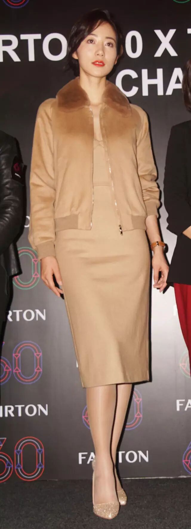 亮相某品牌活动现场,连衣裙、外套、高跟鞋,一身驼色和谐统一,简单大气,气质满满。