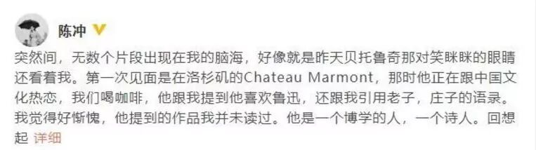得知贝托鲁奇离世的消息后,曾在《末代皇帝》中饰演婉容的陈冲发微博悼念,“《末代皇帝》的制作,像是一场八个月的婚礼,庞大热闹而混乱,而我做了八个月的新娘,每天等待着贝托鲁奇将盖头掀开,又一次爱上我。”