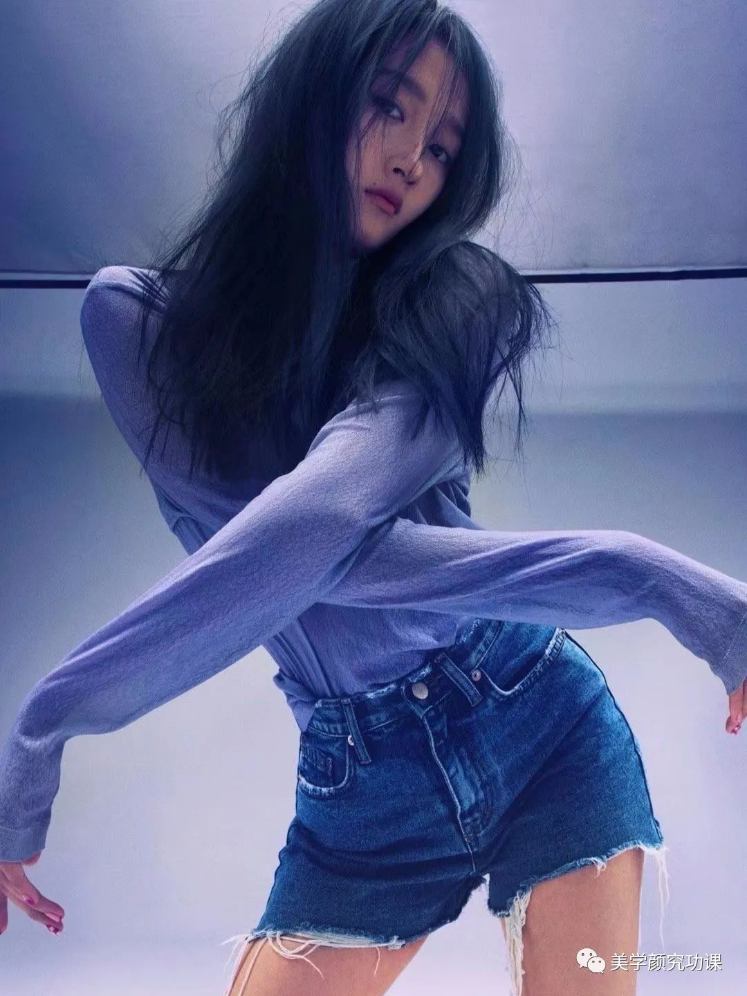 眼睛长度和脸部比例相符合。眼角没有内眦赘皮。还有很好看的双眼皮。眉毛部分就稍微有点小问题了。她的眉眼间距偏宽,所以显得她的上庭很短,中庭偏长,且有时候显得肿泡眼。下三白重,瞳孔占比小,眼距近,聪明伶俐感足。