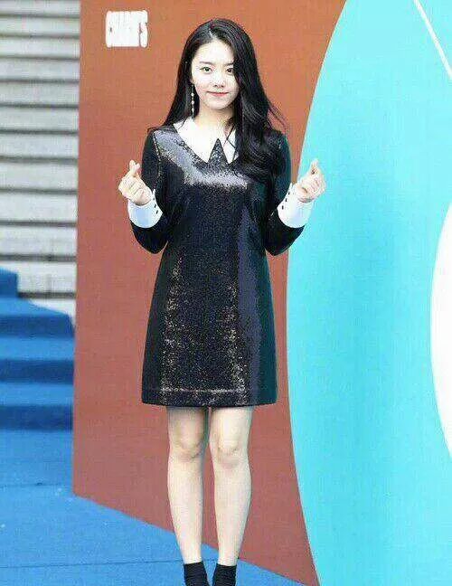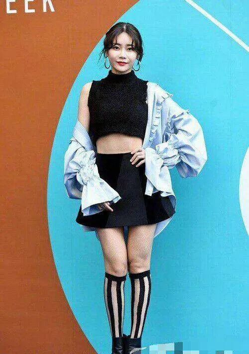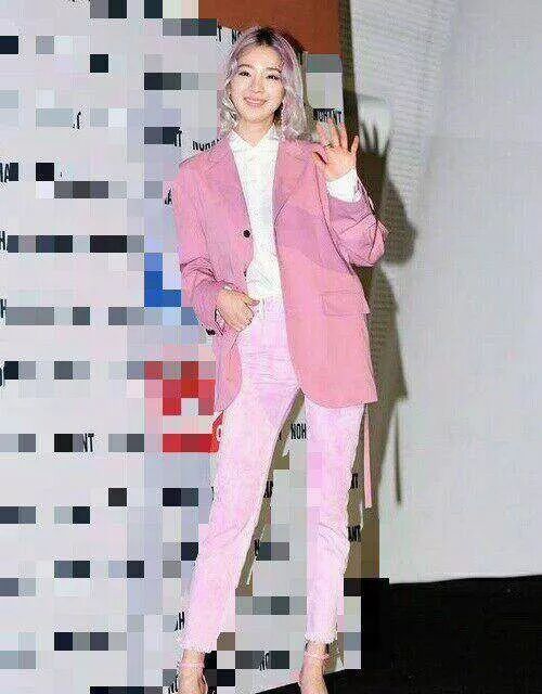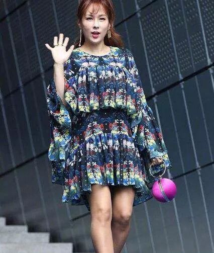 朴景丽就一身拼接的装扮出现在大家的面前。