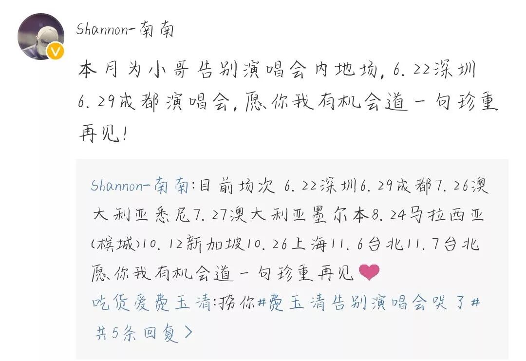 一位叫‘Shannon-南南’的网友,一一罗列出了费玉清后面要去巡演的详细日期和地点,并附上留言:愿你我有机会道一句珍重再见。