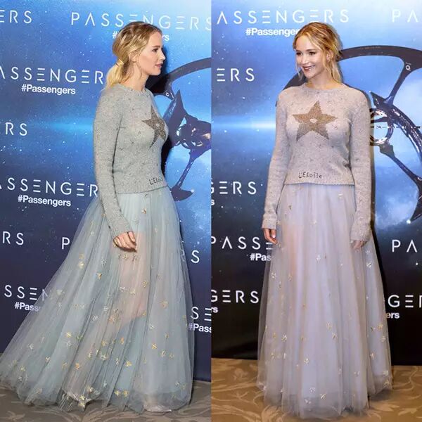 前段时间,Jennifer Lawrence在电影《太空旅客(Passengers)》发布会上,就选择了一身来自Dior 2017春夏系列的套头毛衣搭配透视长裙,优雅迷人又很有亲和力。