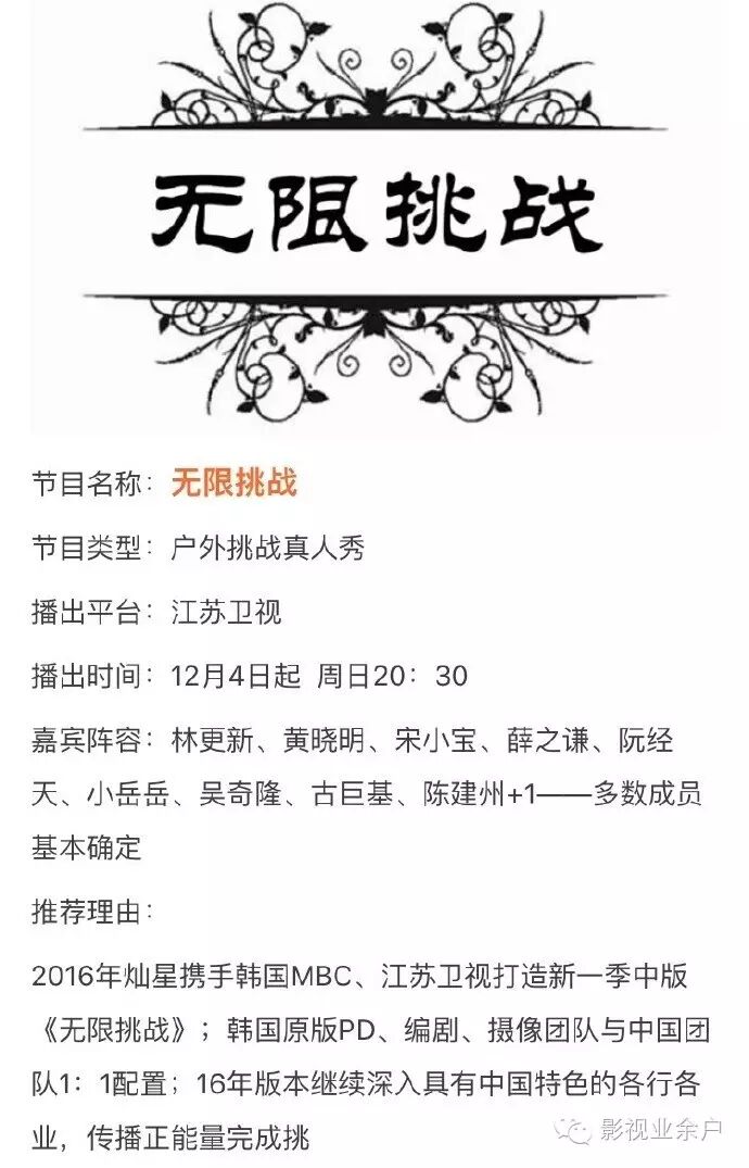 @传媒圈外人:2016江苏卫视中国版《无限挑战》播出时间,暂定12月4日起每周日20:30,嘉宾阵容大致为林更新、黄晓明、宋小宝、薛之谦、阮经天、岳云鹏、吴奇隆、古巨基、陈建州等,其中多数成员基本确定。