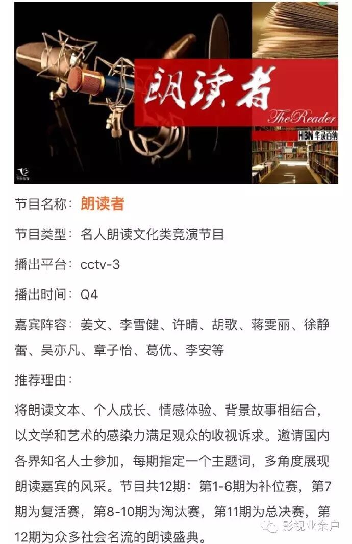 @卫视大混战:CCTV名人朗读文化类竞演节目《朗读者 》,邀各界知名人士参加。嘉宾:姜文、李雪健、许晴、胡歌、蒋雯丽、徐静蕾、吴亦凡、章子怡、葛优、李安等。每期指定主题词,展现朗读嘉宾风采。第1-6期补位赛,第7期复活赛,第8-10期淘汰赛,第11期总决赛,第12期众社会名流的朗读盛典。CCTV3综艺频道Q4播出。