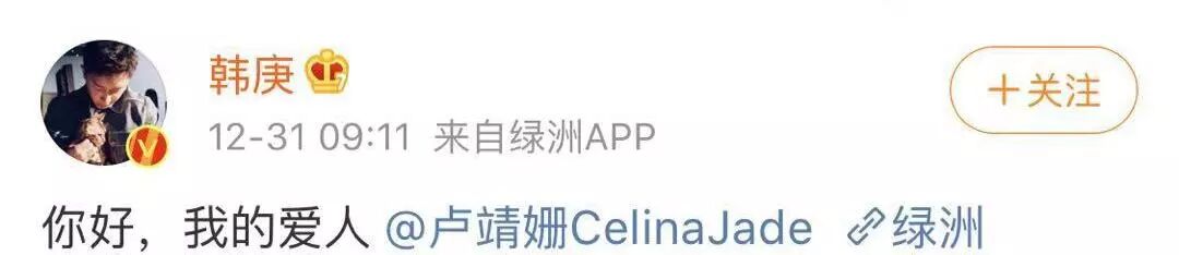 今天一早,韩庚卢靖姗前后脚官宣,并且艾特了彼此:你好,我的爱人。