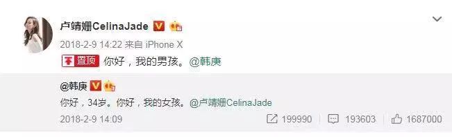 2月9日,韩庚34岁生日当天,两人直接在微博官宣公布了恋情,就是经典的:“你好我的女孩”“你好我的男孩”。