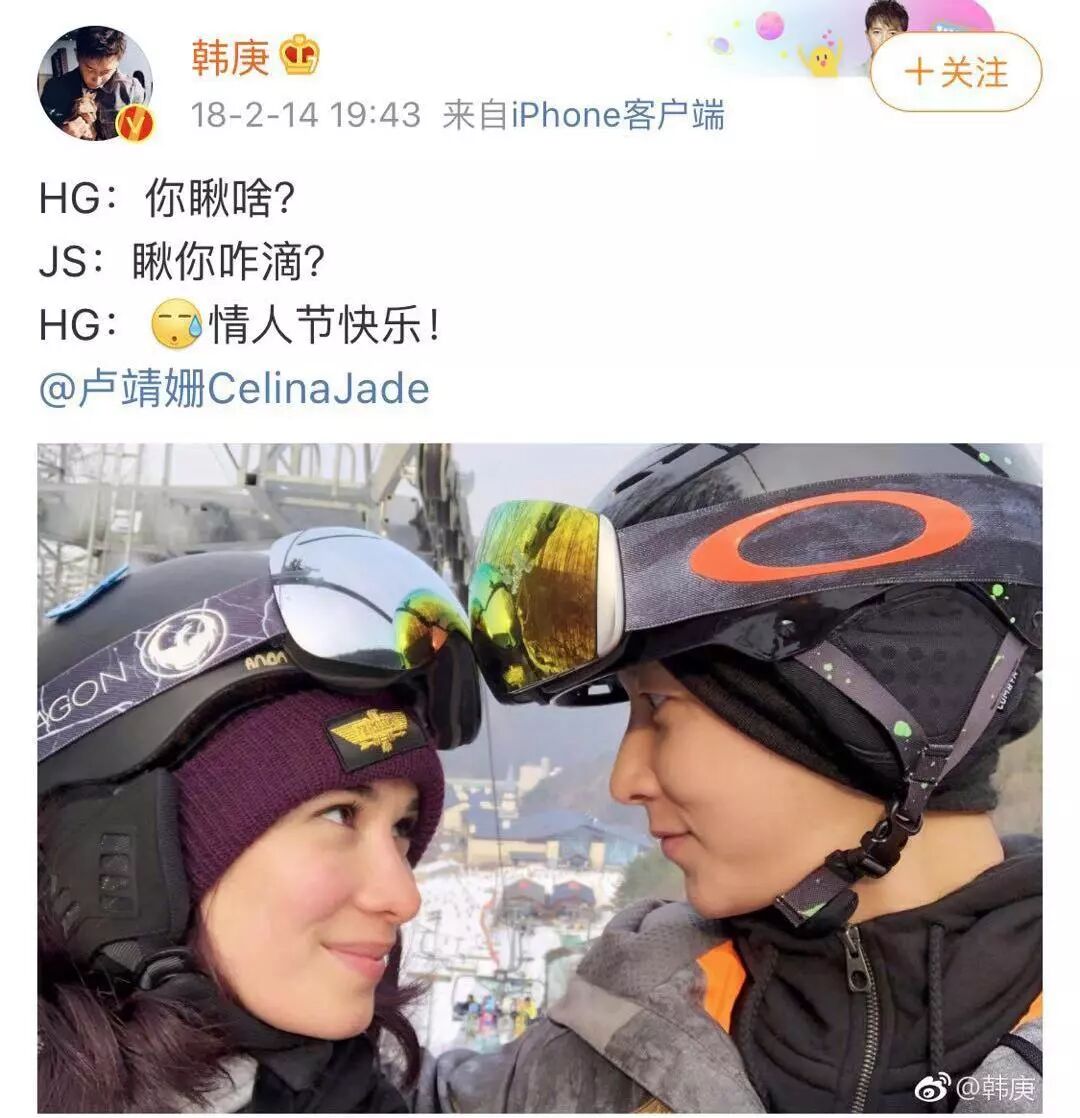情人节两人还一起去滑了雪,那也是公开之后,韩庚第一次发两人的甜蜜照。