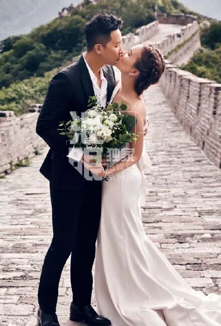 随后,两人手持捧花在长城上深情拥吻,画面也太让人羡慕了。