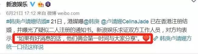 6月21日,港媒曝出了韩庚和卢靖姗的结婚登记书,女方名字看不清楚,可生日总能对得上,但双方却否认了,说有了好消息会和大家分享。