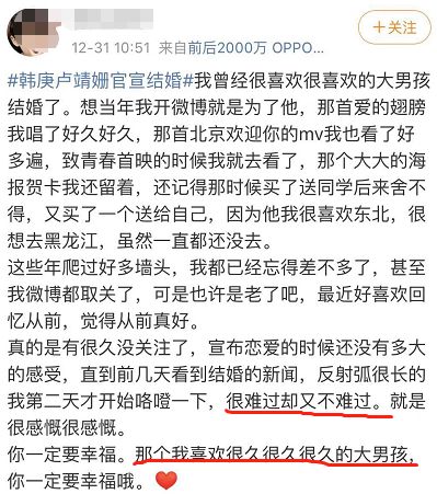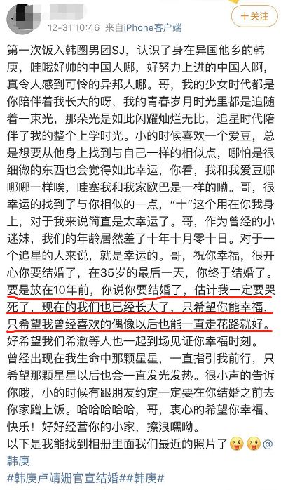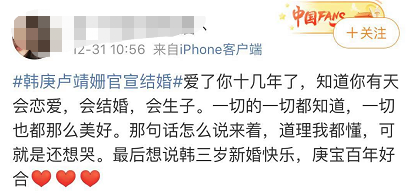 兜兜转转,男孩女孩终于修成了正果,看着粉丝们送上的祝福,南风竟然有点泪目。如果韩庚十年前选择结婚粉丝一定会哭死,但是现在那些喜欢他的粉丝已经长大了,只希望他能幸福。