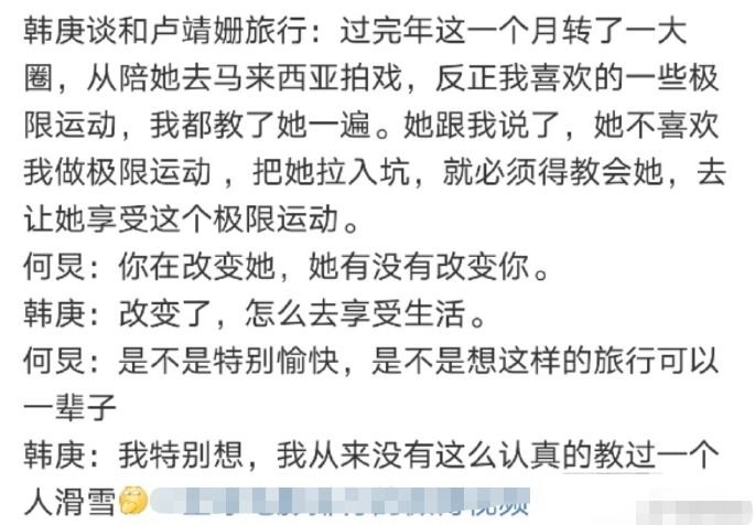 其实,卢靖姗不是很喜欢极限运动,是韩庚带她入了坑,韩庚还说自己从来没有这么认真地教过一个人滑雪。