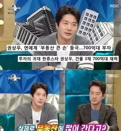 这期的节目还有一个很大的关注点,就是权相佑名下房产的价值。前段时间有媒体公开了韩国娱乐圈各大艺人的不动资产排行,权相佑以560亿排名前五,甚至还有专家预估包括国外的房子在内会超过700亿韩元。这次在节目中毒舌金九拉当然不能够放过这个话题,问起了权相佑是否真的拥有700亿的不动产。