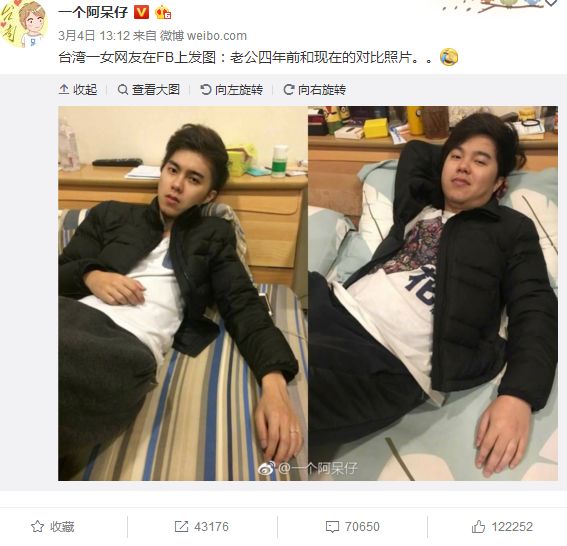 前几天,一位台湾女生发了一条微博,晒出老公四年前和现在的对比照,妹子自己感叹:“四年前有吴亦凡的气质,现在怎么看有点像八戒……”