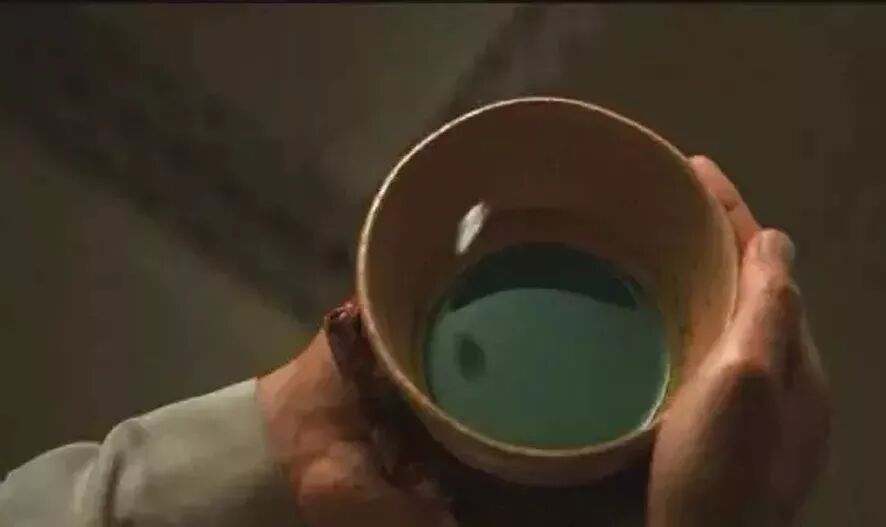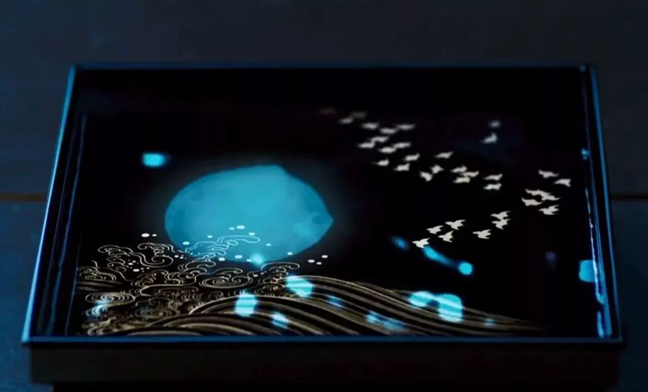 影片中,织田信长与众茶人赏美物,千利休取一莳绘海鸟波涛纹漆盘倒入清水,镜花水月。