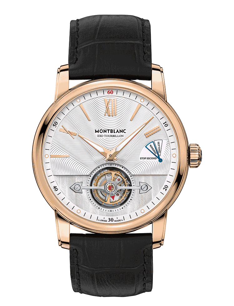 全新万宝龙外置陀飞轮超薄腕表作为此次110周年巨献之作,采用了品牌专利外置陀飞轮复杂功能,同时搭载快速停秒装置。银白色表盘上半部分饰以醒目的万宝龙六角白星玑镂设计,下半部分为“日内瓦波纹”图案,衬托着位于6时位置的精美外置陀飞轮结构。