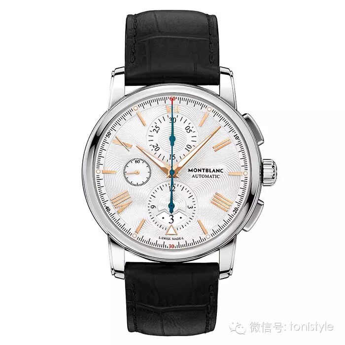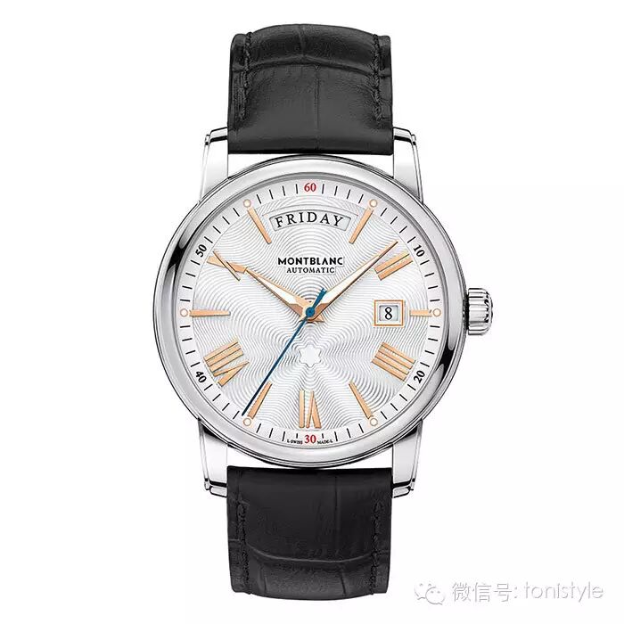 该款腕表搭载了万宝龙MB24.18机芯,透过表背上的内置窗格蓝宝石水晶镜片,机芯精美的结构和装饰细节尽收眼底。黑色鳄鱼皮表带,与银白色表盘、玫瑰金镶饰细节相映成趣,优雅动人。 高级复杂功能在3时位置显示日期,在12时位置显示星期,仅需一眼即可纵览时间信息。