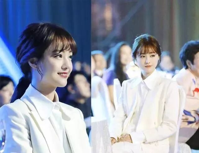 扎着一个低马尾,一件白色的衬衫,领口的黑色设计,增添了一丝亮色,但是郑爽却没有撑起这件西装,给人一种纸片人的感觉。