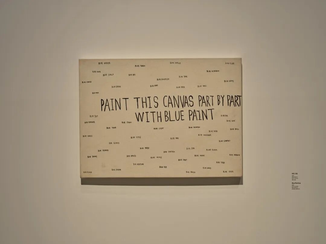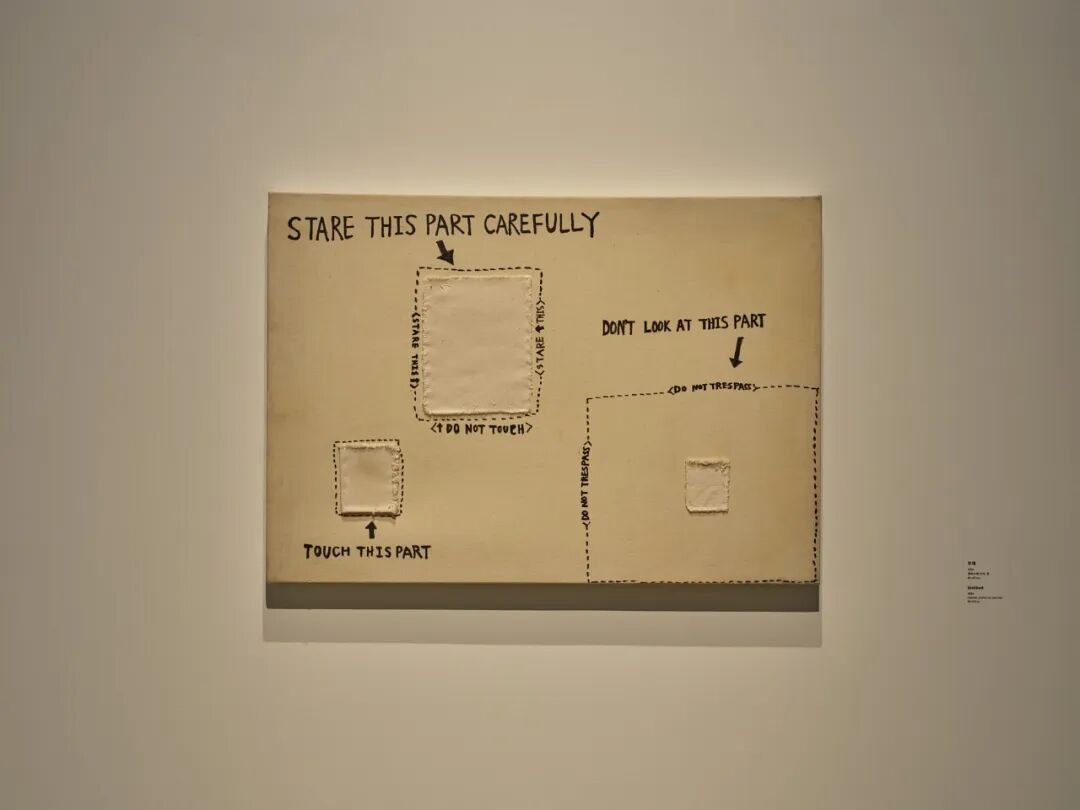 金范是画家出身。在他20世纪90年代成长期的作品中,你可以看到他对艺术创作惯例的质询,以及对绘画应如何表现、如何呈现并如何面对观众的困惑。他通过剪裁画布,折叠襟翼并扣上纽扣来制作《自画像》(Self-Portrait, 1994)的衬衫口袋。同年,他将一块块长方形的帆布缝合起来,制作了《砖墙1号》(Brick Wall #1,1994)。在另一件作品中,金范则选择在画布上贴上棉布块,并用黑色记号笔画出箭头,甚至制定了一些指令:“不要看这部分”“触摸这部分”。而其创作于1995年的一幅无题作品上附着一张写有提示的卷起的纸,上面写着:“带上这首诗”。然而,在首尔三星美术馆举办的回顾展上,入口处的一位展厅工作人员不断告知着观展人禁止触摸作品,作品的原意被悬置、被异化,这使得金范的作品显得更有趣和悲伤了。