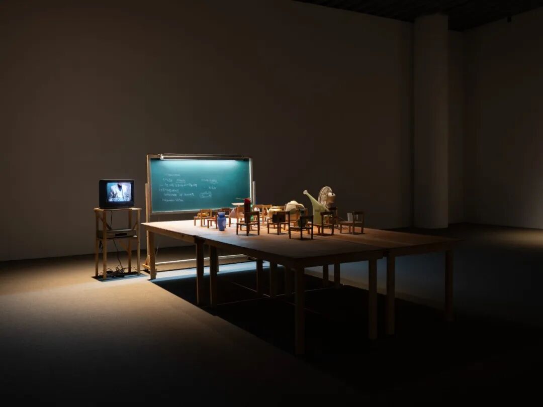 创作于2010年的一件名为《物品被教导它们只是工具而已》(Objects Being Taught They Are Nothing But Tools)的装置作品上演了一场教化课。台扇、水壶、小夜灯等廉价的家用产品被放置在黑板和电视机前的小椅子上,同时,电视里的一名男子正在进行乏味的演讲。他说:“你们其中一些用电,另一些用电池。”你或许会为这些物品感到抱歉。尽管我努力提醒自己它们只是物品而已,但当我想到我们所构建和忍受的所有系统性控制时,内心还是会忍不住涌起一股歉意。
