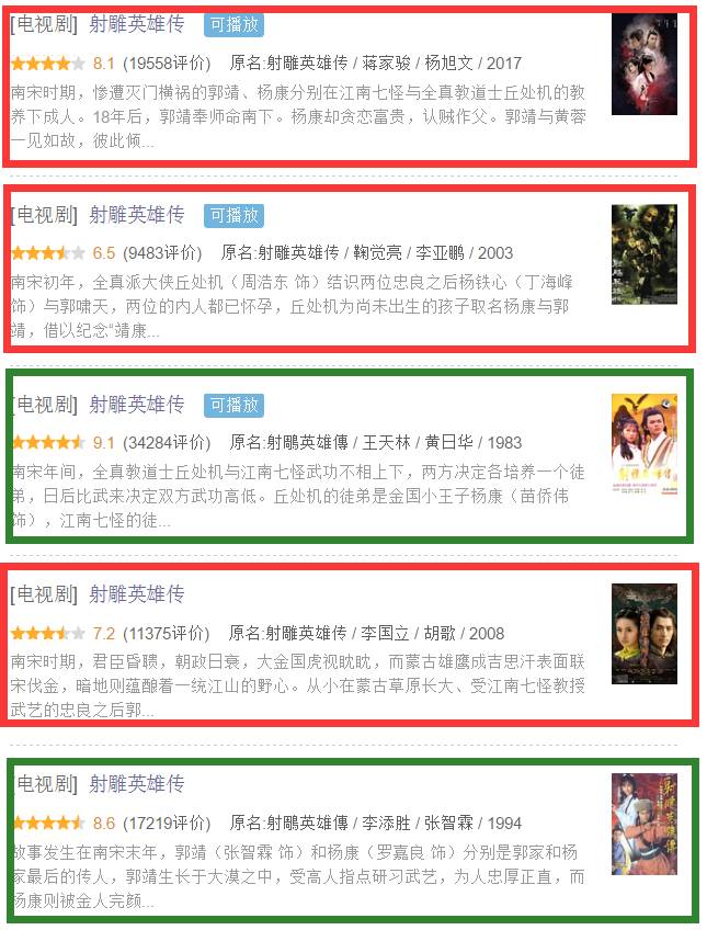 标注为红色的大陆版, 标注为绿色的是香港版, 香港两个版本的分数高于大陆所有版本, 在大陆版本中张纪中翻拍版本分数更是只有惨不忍睹的6.5分, 都快压到及格线了。 然而, 今年的新版本, 在非知名新兴阵容出演的情况下却是好评不断, 豆瓣的8.1分也是高于过去两个版本。 而且豆瓣普遍不待见由演技不突出靠脸在娱乐圈混的演员演的电影, 如李易峰、吴易凡作为主角参演的电影不出意外肯定会被往死里踩。 因此, 新射雕的评分理论上应该高于豆瓣影评的8.1分。