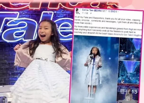 9岁香港「小巨肺」谭芝昀(Celine)在美国才艺真人骚《全美一叮》(America's Got Talent,AGT)中被淘汰,未能杀入决赛。早前萧定一和Celine爸爸谭顺生发表完感受后,Celine刚刚终于在社交网首度开腔谈出局感受,她用英文留言多谢fans支持:「Hi all my Fans and Supporters, thank you for all your votes, clapping hands, encores , comments and messages, I got them all and they are more than words:). #celinetamfans
