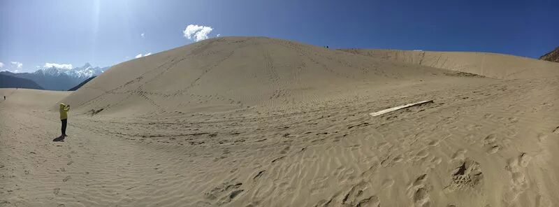 冬春季节,雅鲁藏布江水势减缓,大片的河床裸露,风戏弄着河床,把上面的沙子吹来推去,堆起一座座沙丘,丹娘沙丘就是其中的一座,而它并不是一座孤独的沙丘。它与碧蓝的雅鲁藏布江水,还有远方的雪山,近处的峻岭,再加上蓝天白云,组合在一起,形成一幅美不胜收的画卷。