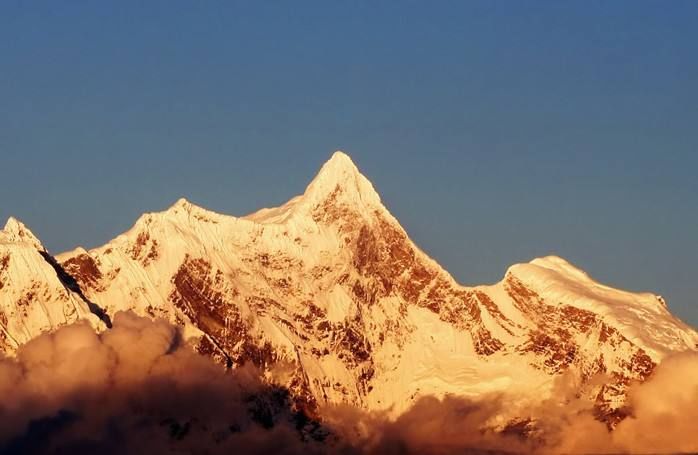 南迦巴瓦峰,地处喜马拉雅山脉、念青唐古拉山脉和横断山脉的交会处,是中国西藏林芝地区最高的山,海拔7782米,位于喜马拉雅山的东端,有“西藏众山之父”之称。南迦巴瓦在藏浯中有多种解释,如“雷电如火燃烧”,又如“直刺天空的长矛',还有一种为“天山掉下来的石头”。南迦巴瓦巨大的三角形峰体终年积雪,云雾缭绕,从不轻易露出真面目,所以它也被称为“羞女峰”,据说能见到南迦巴瓦真面目的人,都是特别幸运的。