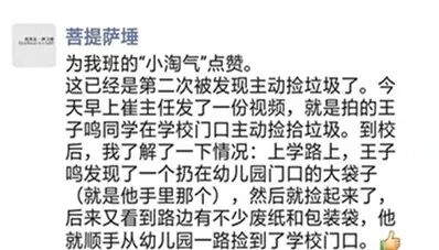 后来,小子鸣不仅自己的桌面干净了,他还经常到处去捡拾垃圾。这不,就光在校园门口这条路上,他就有两次被崔娟老师发现在上学路上捡拾垃圾了!