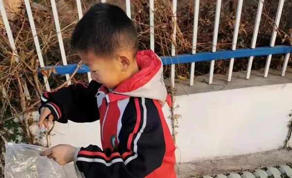 这就是今天的主角——叩官小学一年级一班王子鸣同学,小雪前一天的早晨,学校政教处崔娟主任当值,她发现王子鸣同学一只手拿着书包,一只手拿着一个塑料袋子在校园前的公路上捡拾垃圾,于是就随手拍下几张照片和一段视频。
