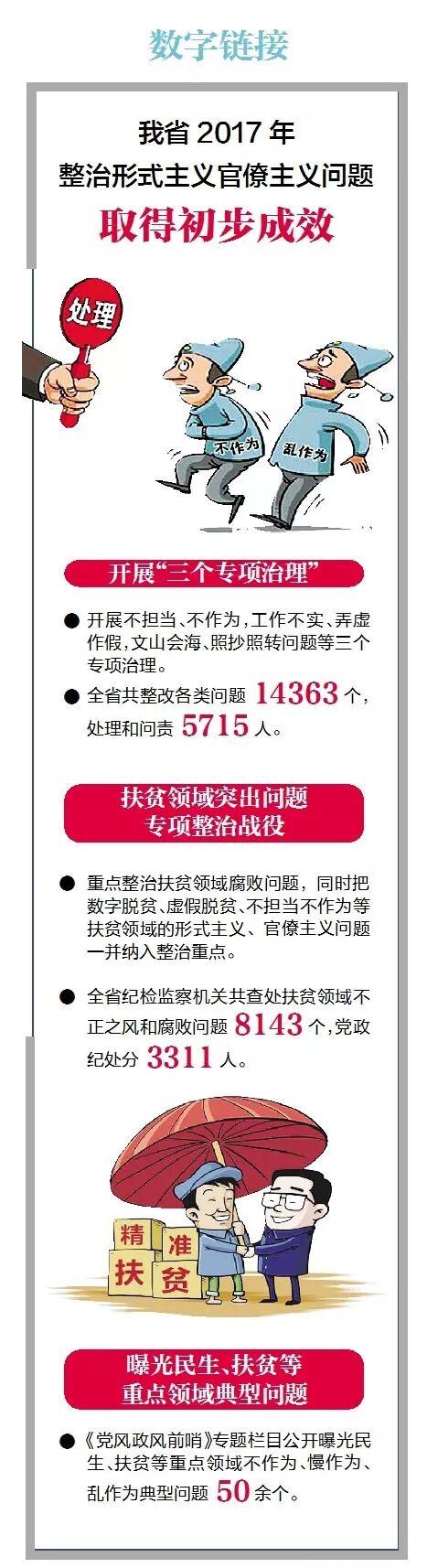 此外,根据中央纪委和省委部署,2017年在全省打响了扶贫领域突出问题专项整治战役,重点整治扶贫领域腐败问题,同时也把数字脱贫、虚假脱贫、不担当不作为等扶贫领域的形式主义、官僚主义问题一并纳入整治重点,全省纪检监察机关共查处扶贫领域不正之风和腐败问题8143个,党政纪处分3311人。