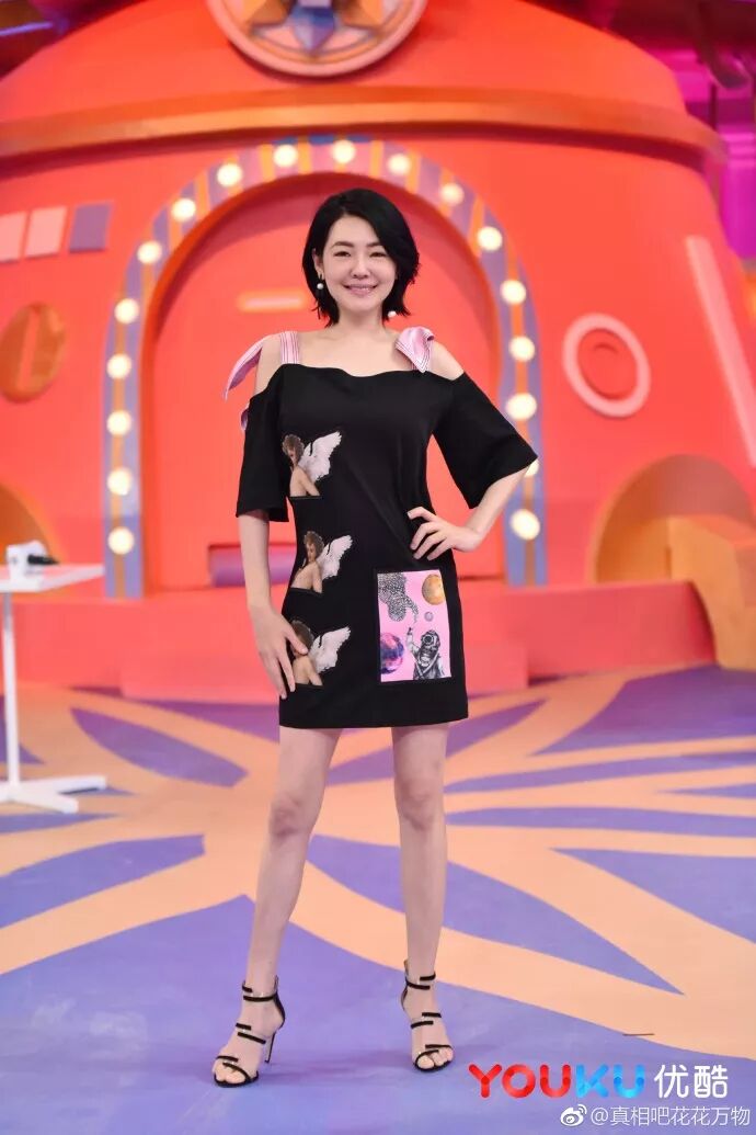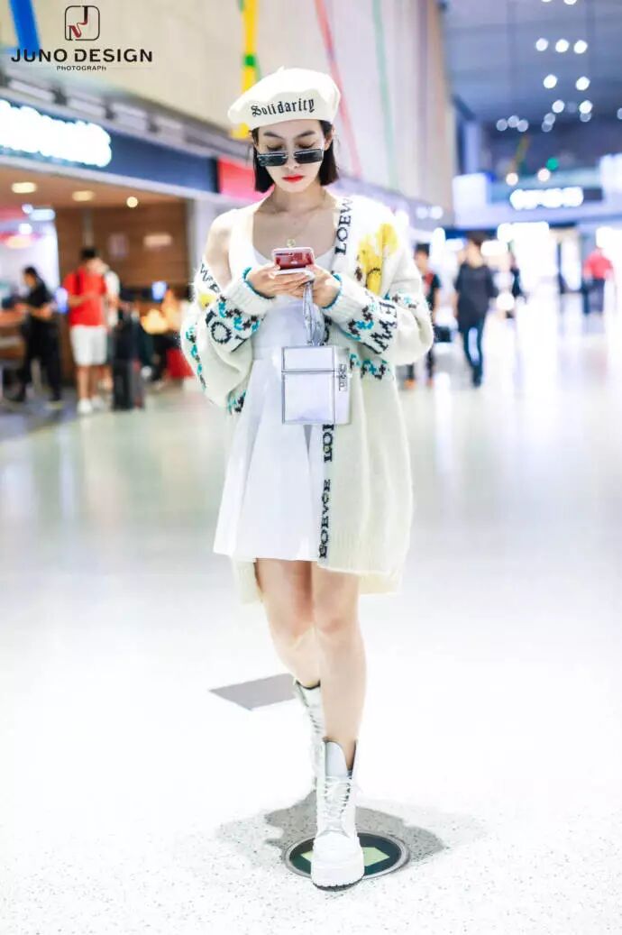 进入秋季女明星开始穿起来针织开衫,宋茜这件loewe印花针织衫搭配吊带裙性感又不失活力,搭配同色系白短靴非常chic。
