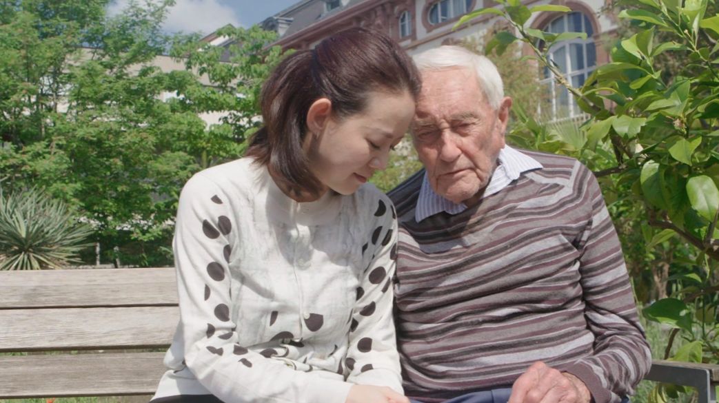 两天前,曾宝仪第一次见到古多尔。那时她刚到巴塞尔,节目组与古多尔预订了同一家旅馆。计程车停在旅馆后的花园边,曾宝仪正准备下车,迎头碰上了刚刚被推出来要去花园吃午饭的老人。古多尔坐在轮椅里,头向前倾,衰老和虚弱扑面而来。他比她想象中的老太多了。护士为古多尔准备的午饭是千层面和红茶,由于咀嚼困难,他必须要把面切成小块才能进食。曾宝仪在一旁给古多尔倒茶。她半蹲在他身边,握着可能是她这辈子握过的最老的手。