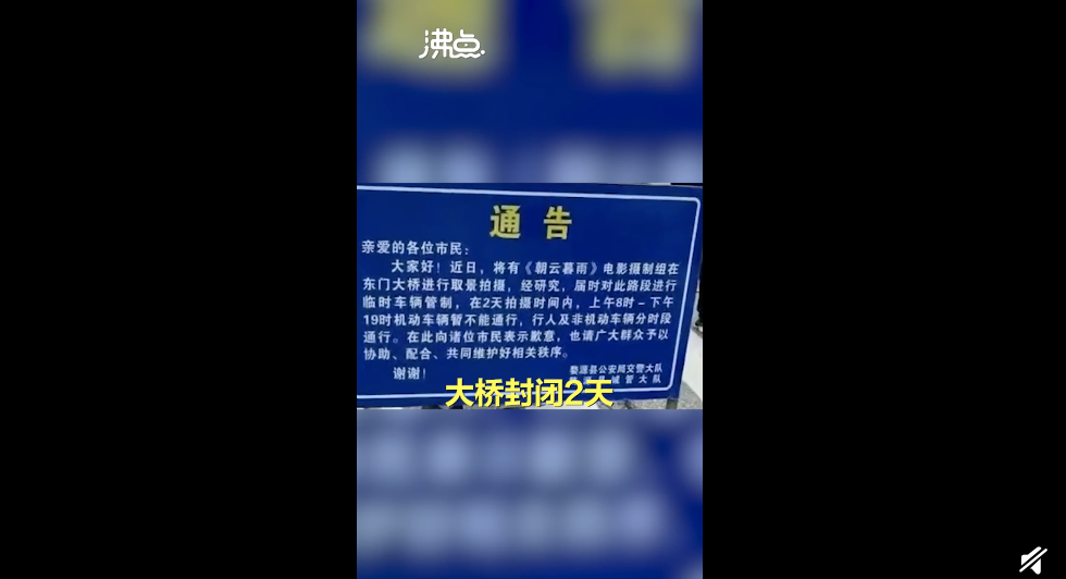 通告中提醒市民,将有电影摄制组在东门大桥进行取景拍摄,经研究,届时对此路段进行临时车辆管制,在2天拍摄时间内,上午8时至下午19时机动车辆暂不能通行,行人及非机动车辆分时段通行。