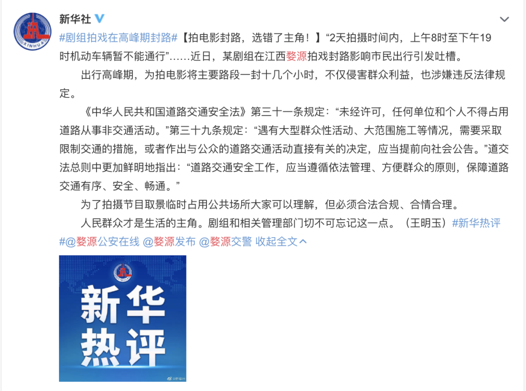 近日,某电影摄制组在江西婺源拍戏封路一事,引发热议。