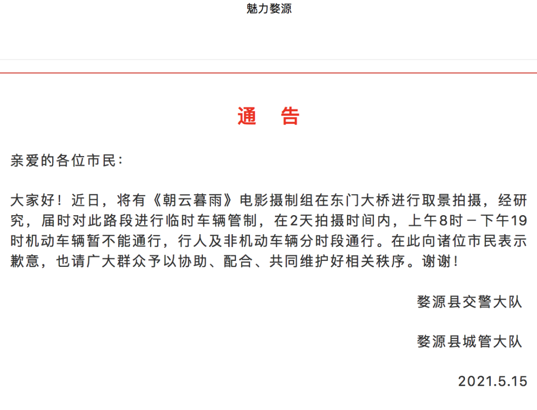 “2天拍摄时间内,上午8时至下午19时机动车辆暂不能通行”……