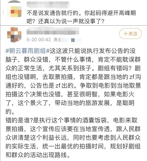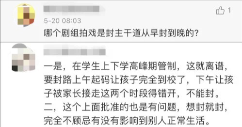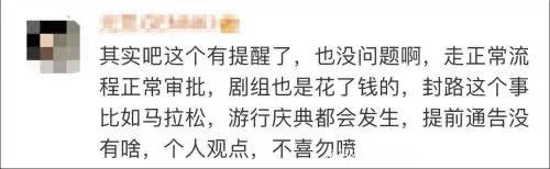 不过也有网友认为,出于对现场安全和秩序维护的考虑,剧组已经和交警大队等相关部门申请了交通管制,并将管制通告通过线上、线下的方式广而告之,那剧组封路就是合理合规的行为,不应该被批评。